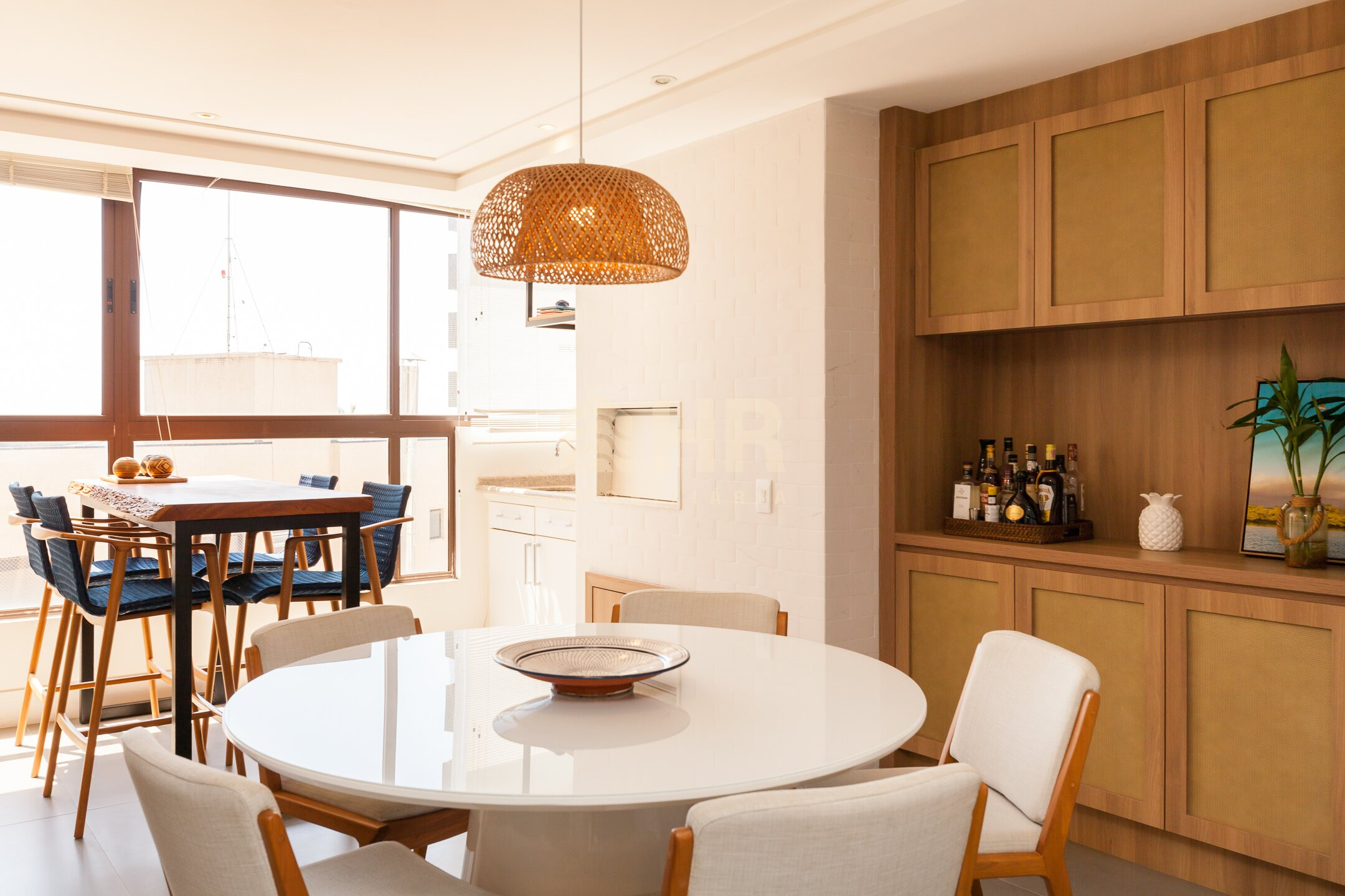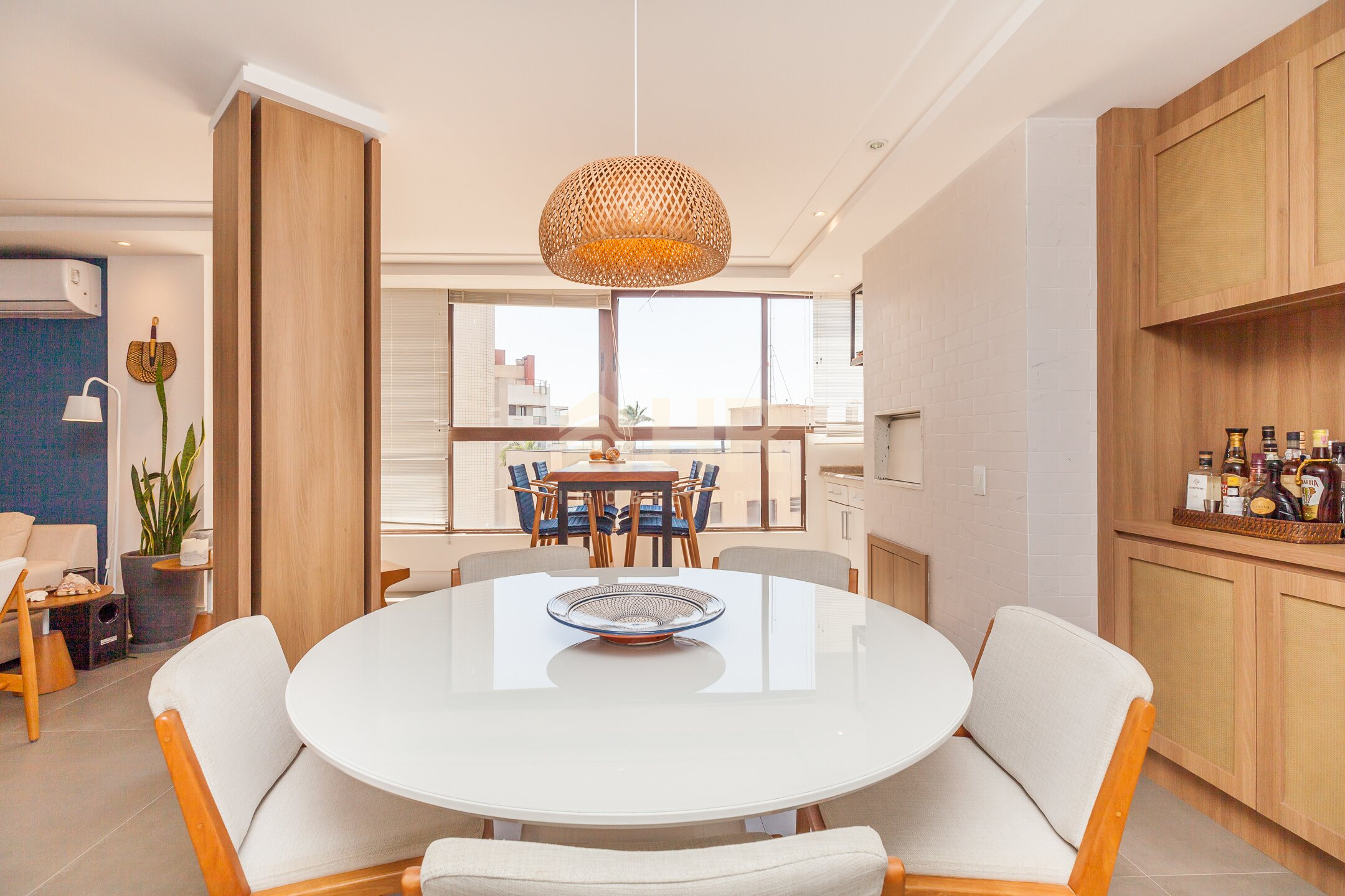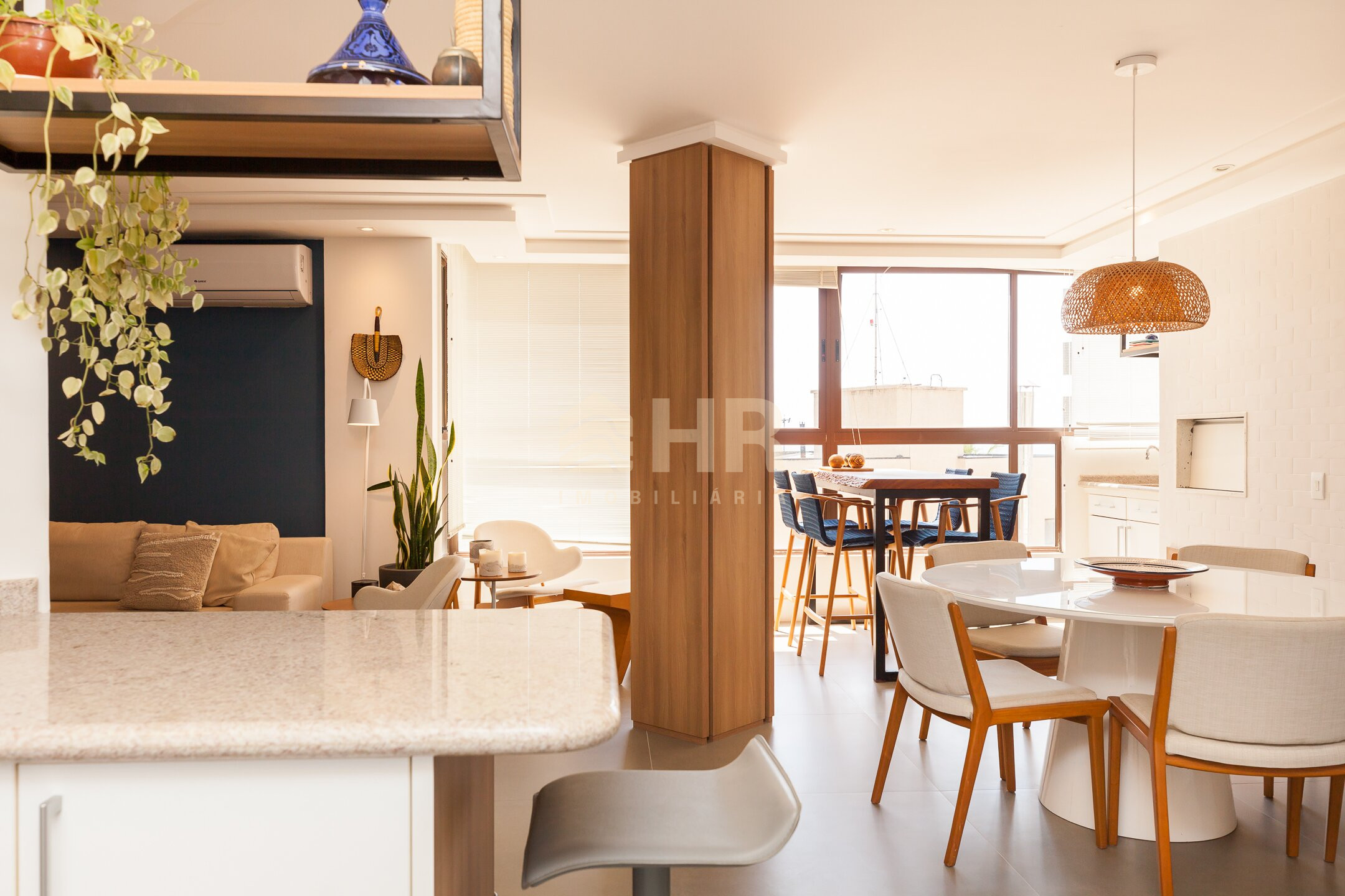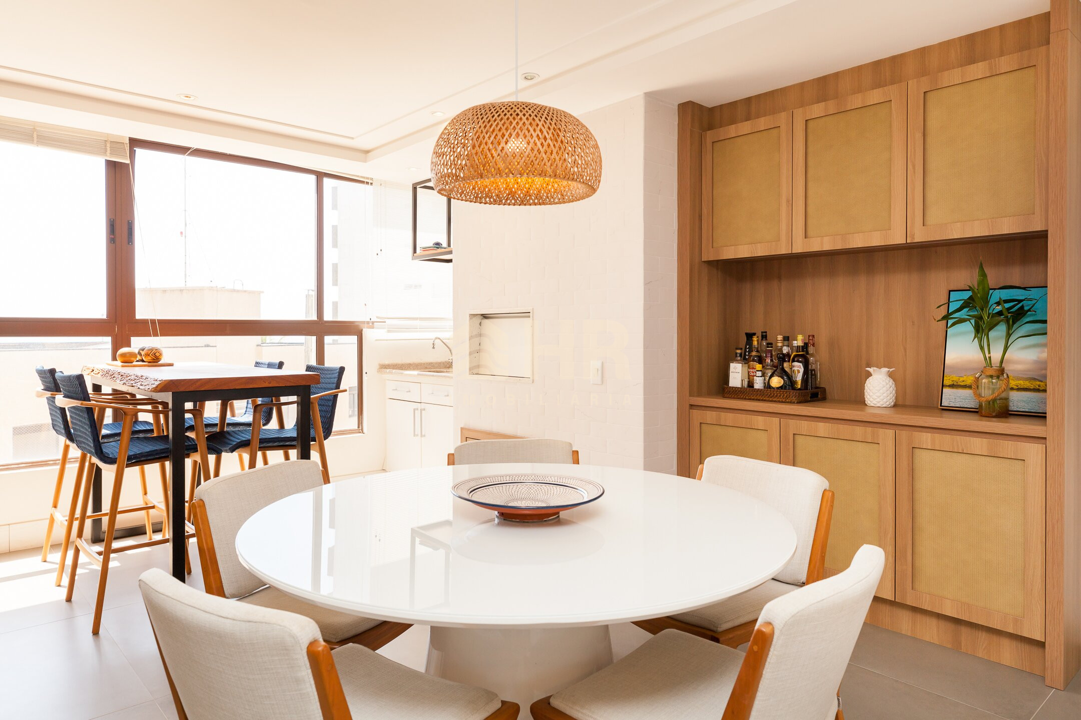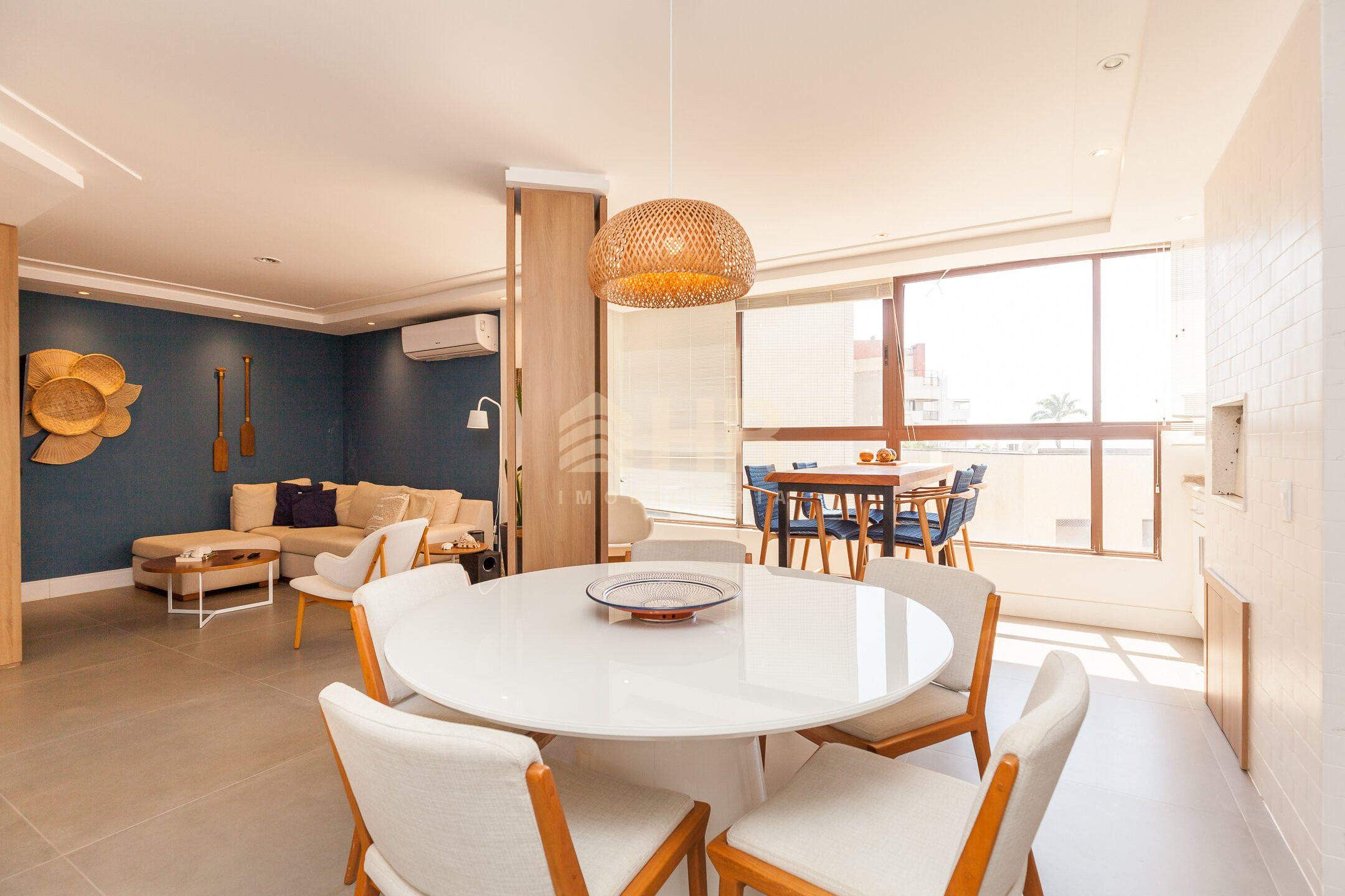 Sala de estar e jantar integradas com acesso a churrasqueira