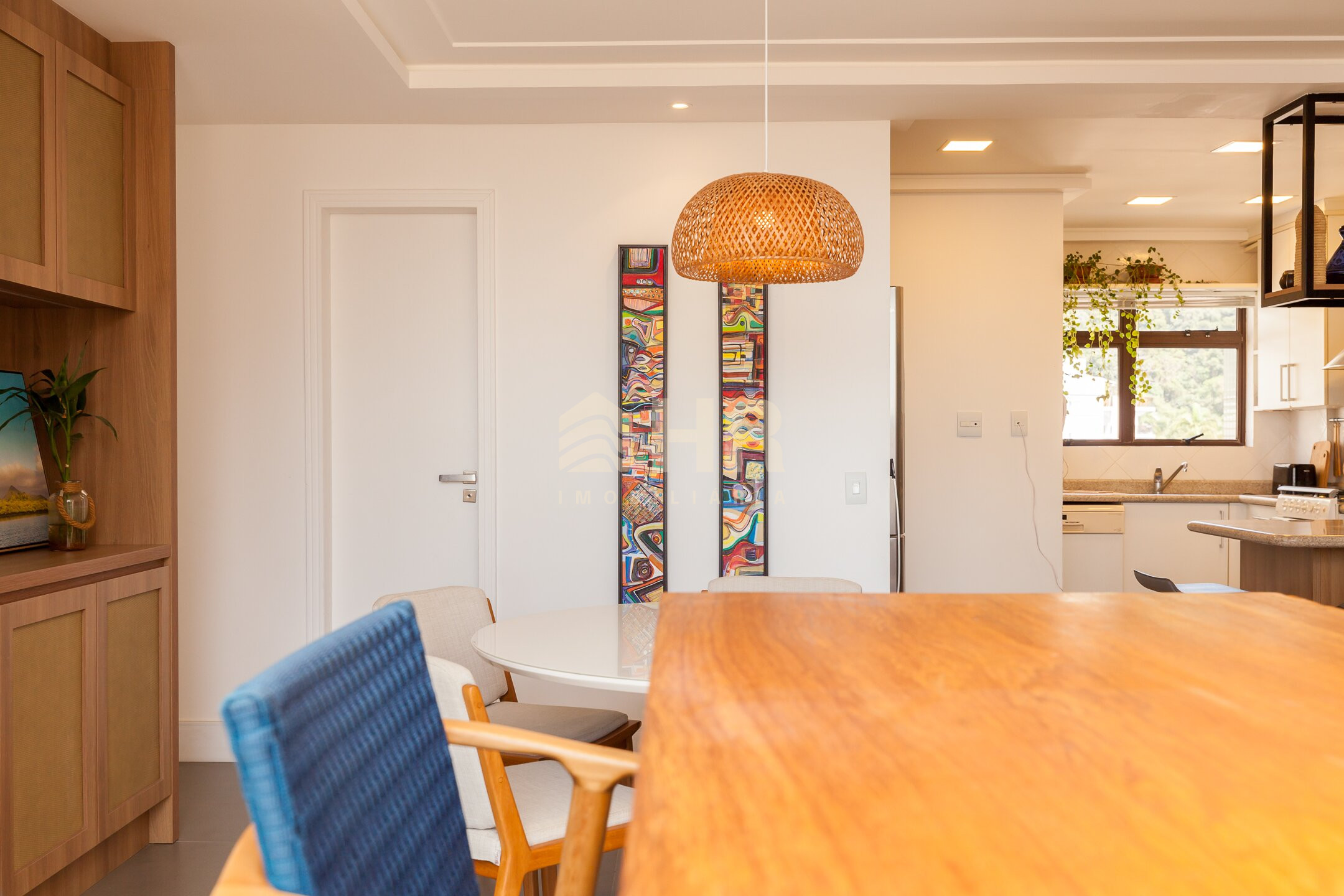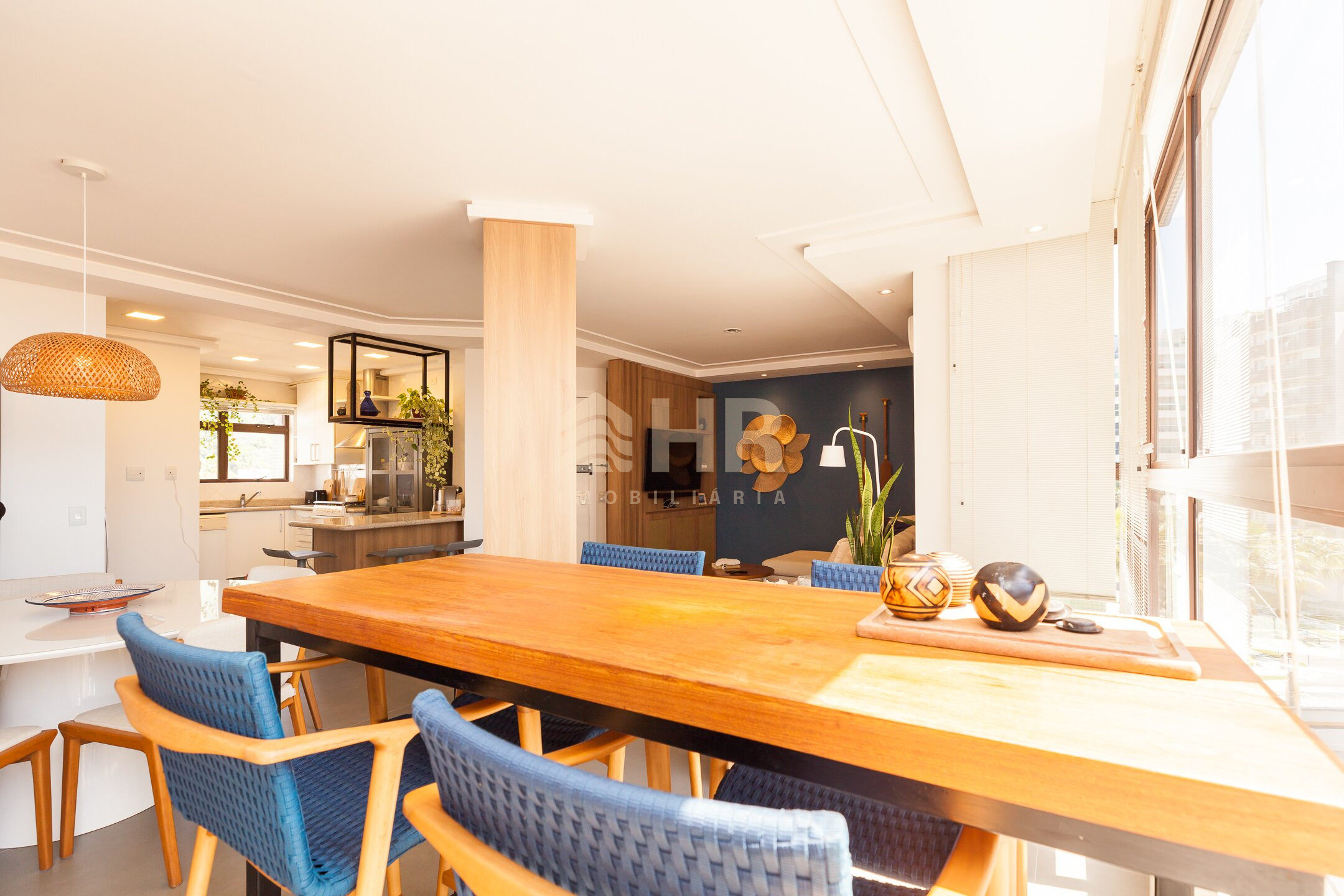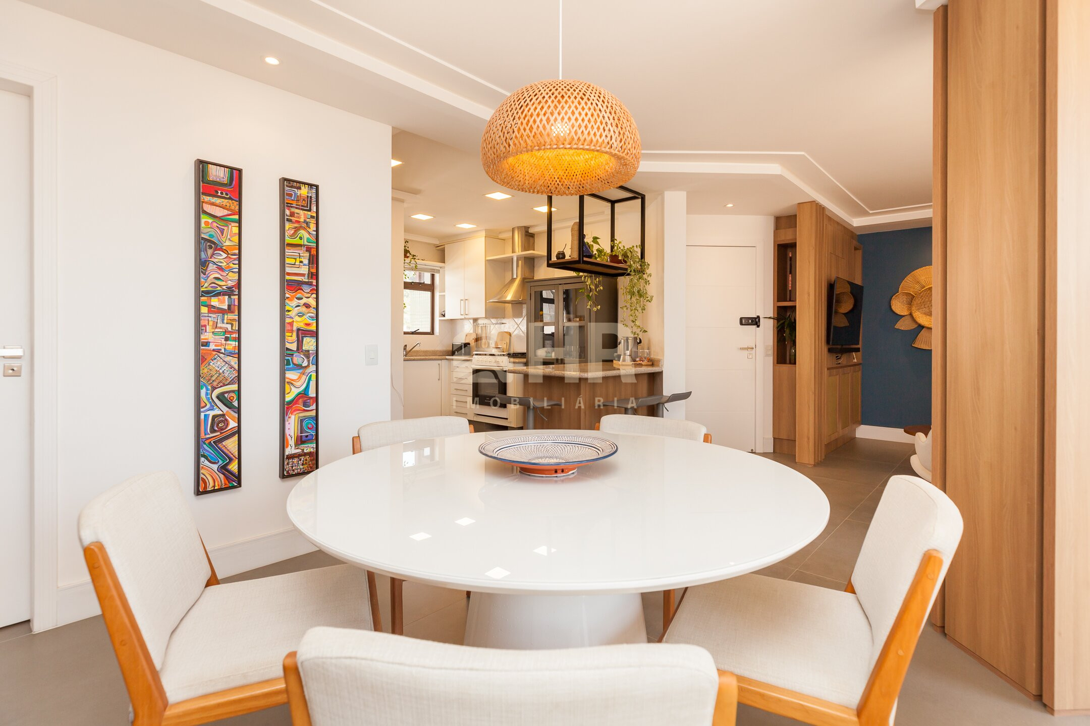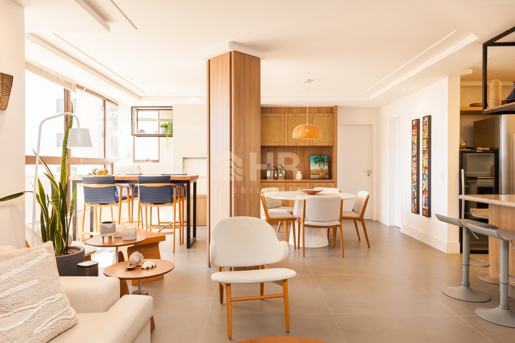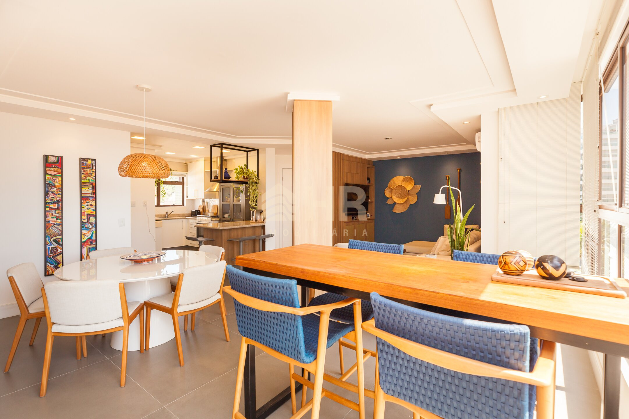 Sala de estar e jantar integradas com acesso a churrasqueira